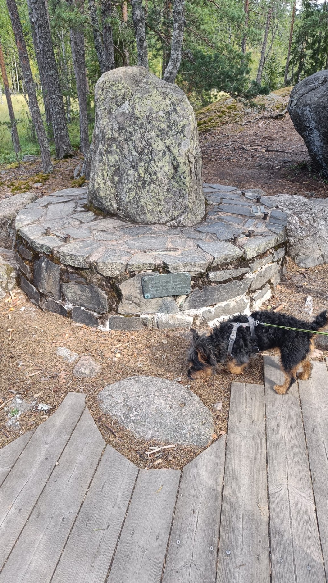 Siitä sitten kohti Kurjenrahkan kansallispuistoa. Päiväunien jälkeen päätimme lähteä tietojemme mukaan noin 6 km pituiselle luontopolulle. Heti alkumatkasta tulimme seitsemän kunnan rajapyykille. Aura, Masku, Mynämäki, Nousiainen, Pöytyä, Turku ja Rusko yhtyvät tässä pisteessä. Rajakivi on jököttänyt paikallaan jo 600 vuotta.